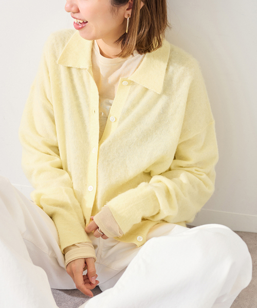 細番手のアルパカ混素材を使用した、ふんわりとした軽さが魅力のカーディガン。製品加工による繊細な起毛が柔らかな風合いを引き立て、顔まわりに華やかさをプラスします。ボタンを留めてポロシャツのように着ると、落ち着きのある大人の装いに。一枚で着映えるデザインは、シンプルなボトムと合わせるだけで季節感のあるスタイリングが完成します。**********************透け感:あり裏地:なし伸縮性:あり光沢感:なし生地の厚さ:やや薄手**********************※素材の特性上、表面の毛羽が他のものに付着したり、繊維の絡みつきや毛玉になることがあります。※取り扱いについては、商品についている品質表示でご確認ください。※こちらの商品は、FRAMeWORK での取り扱いになります。直接店舗へお問い合わせの際は FRAMeWORK 店舗へお願い致します。※照明の関係により、実際よりも色味が違って見える場合があります。またパソコン・スマートフォンなどの環境により、若干製品と画像のカラーが異なる場合もございます。予めご了承の上ご注文ください。※商品の色味は、商品アップ画像をご参照ください。本体:ドライクリーニング