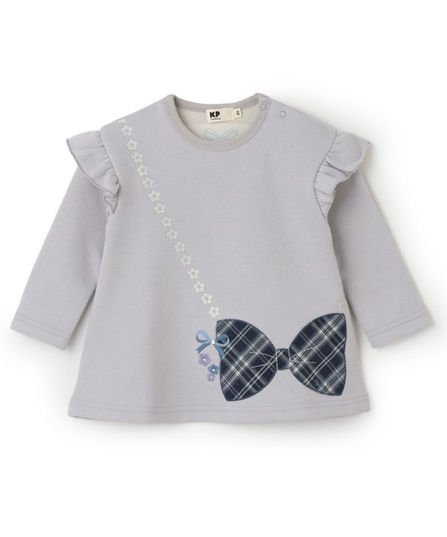さりげなくきらめくラメ入りの裏毛素材のAラインチュニックです。ドロップショルダーに重ねた肩のフリルと、リボン型ポシェット風のアップリケがアクセントに。1枚で存在感あり、お出掛けスタイルにもぴったりなアイテムです。
