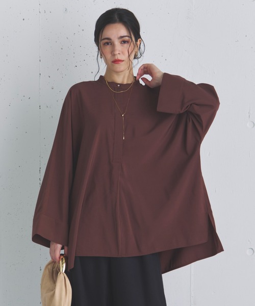 ゆったりシルエットでキレイ見えながら体型カバーが叶う1枚【point】・ポンチョのようなシルエットでゆったりとした着心地・ハリ感があり身体のラインを拾いにくく腰回りをカバーする長めの着丈も嬉しいポイント・スキッパーデザインなので開けて抜け感を出すと雰囲気が変わります・カフスの幅が広いので折り返して手首を見せるのも◎・ゴールドのボタンがさりげなくオンオフ兼用で着られます【fabric】・少しハリ感のあるさらっとした生地透け感:なし裏地:なし伸縮性:なし光沢感:なし生地の厚さ:普通【注意事項】・画像の商品はサンプルです。実際の商品と仕様、加工が若干異なる場合があります。・サイズ表記はあくまで目安となります。・取り扱いについては、商品についている品質表示でご確認ください。・照明の関係により、実際より明るく見える場合がございます。またパソコンなどの環境により、製品と画像のカラーが若干異なる場合がございますので、予めご了承くださいませ。■お気に入り登録がオススメです!■《商品のお気に入り登録》カラー・サイズ選択の横の「♡」をクリックで簡単に登録できます完売カラーの再入荷や在庫が1点になったとき、セールになったときに通知をお届けします《ブランドのお気に入り登録》ページ上部のブランド名の「♡ お気に入りブランドに追加」をクリックで簡単に登録できます新商品の情報やイベントなどお得な情報をいち早くお届けします是非、ご登録お願いします♪