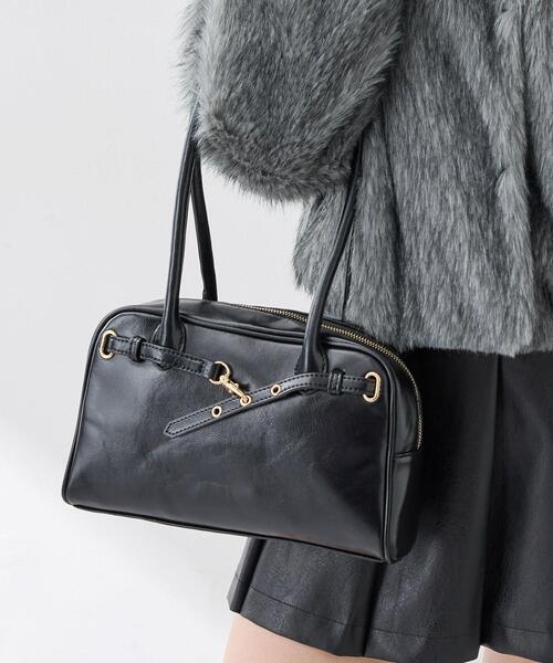 【お出かけシーンにもぴったりな小さめサイズのボストンバッグ】 長めの持ち手はショルダー掛けも可能です。 小振りながらもマチがあるので見た目以上の収納力。 フロントに斜めに配置したベルトがスタイリッシュなアクセントになっています。 内側には小物を入れるのに便利なポケット付き。 ツヤのあるフェイクレザーや落ち着いたフェイクスウェードがラインナップ。 ・A4サイズ不可 ・裏地あり ・内ポケットあり ・重量:約278g