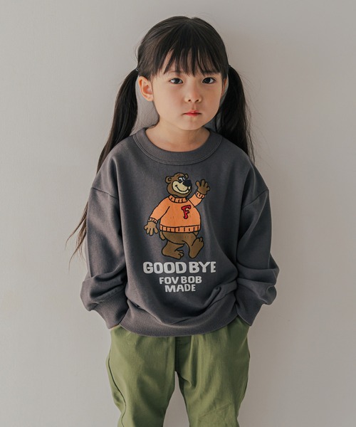 小さいお子様向けのFOVBOBのスウェットトレーナー。かわいらしいイラストプリントがポイントです。速乾性のあるポリエステル混の裏毛素材です。-----透け感:無し伸縮性:ありポケット:無しMODEL 01 / 106cm / 18kg / 110サイズ着用MODEL 02 / 105cm / kg / 110サイズ着用
