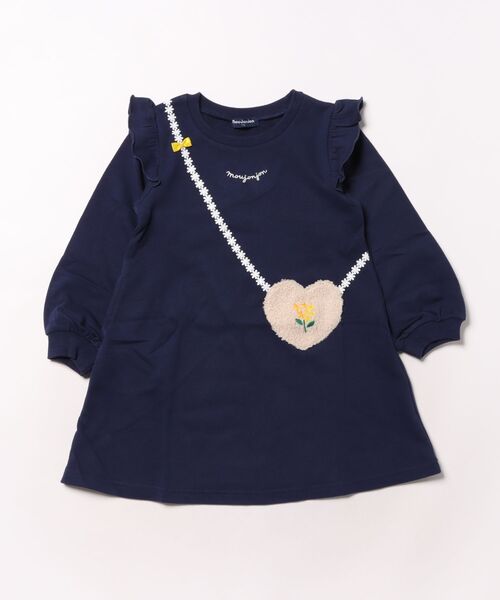 綿100%の裏毛素材のワンピースはコスモスとキンモクセイの秋の花が刺繍されたボアポシェット付きです。ポシェットは飾りです。右脇にポケットがあります。
