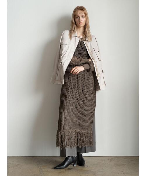 テープヤーンを使用し、フリンジのあしらいがポイントのメッシュ編みワンピース。今季注目のボヘミアンなムードを裾に同素材で施したフリンジで表現。軽やかな風合いでリラックス感がありながら、1枚で着映えするアイテムです。レイヤードスタイルにすることで普段のオシャレをワンランク格上げしてくれます。デイリーに活躍する一枚です。※商品画像は、撮影環境やお客様のご利用のPC・スマートフォンのモニター環境などにより実物と色味に差異がある場合がございます。