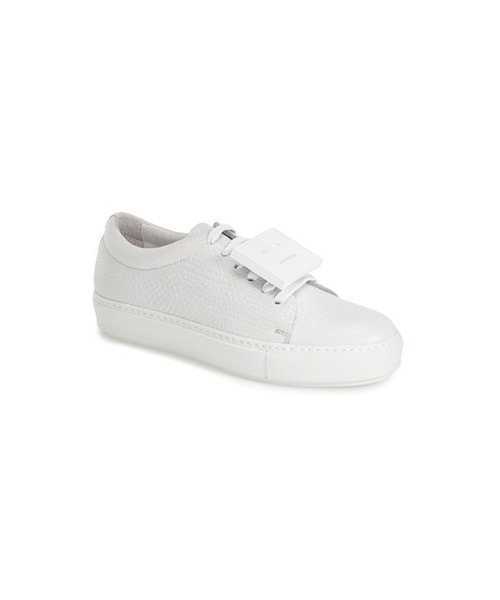 An emoticon detail may ornament the laces, but you'll be feeling much more than "meh" in this menswear-inspired leather sneaker set on a chunky platform sole. Pair with skinnies or cropped styles to show off Acne's playful take on the sport-chic footwear trend. 1 1/4" platform (size 39). Removable face plate. Leather upper and lining/rubber sole. By Acne Studios; made in Italy. Salon Shoes.