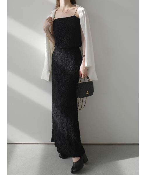 【デザイン&ディテールポイント】 存在感のあるベロア刺繍が、シックでエレガントな雰囲気を演出するセットアップ。 トップスは華奢なストラップとスクエアネックが女性らしい印象を引き立てつつ、コンパクトな丈感がスタイルアップを叶えてくれます。 スカートは程よくボディラインに沿うロング丈。 高級感のあるベロア素材やフロッキー刺繍を重ねることで、シンプルなブラックながらも奥行きとニュアンスが生まれ、洗練された印象に仕上がっています。 【コーディネートポイント】 セットアップで着用すると、大人っぽく華やかな雰囲気に。 ジャケットを羽織れば秋のスタイリングが完成。 上下別々でも着回しがしやすく、トップスはワイドパンツやデニムでカジュアルダウン、スカートはリブニットやシャツと合わせて大人の抜け感を演出できます。 ブラックベースながら素材の表情で軽さがあり、重たく見えないのもポイント。 ※セットでの購入は単品買いに比べ2,900円お得に購入ができます。