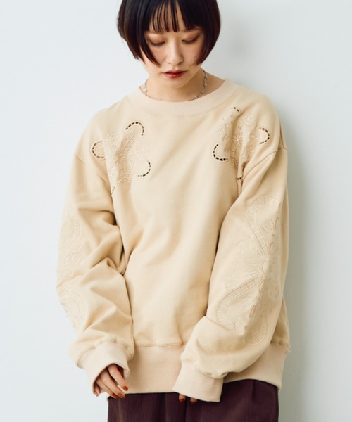 【華やかな刺繍が目を惹く、ラフながらもデザイン性のあるスウェット】・ヴィンテージのハンカチをイメージした刺繍を胸と背面、袖にそれぞれ贅沢に施したデザイン・リブ始末にすることでカジュアルな雰囲気に・オーバーサイズでゆったりとした着心地、ボトムを選ばない絶妙な丈感に仕上げています・裏毛スウェット生地を使用し、冬でも暖かな素材感~スタイリング~デニムやイージーパンツとカジュアルダウンさせた着こなしはもちろん、フレアスカートとレディライクなスタイリングも◎秋冬らしいチェックのボトムスとも相性良く着られます。シャツやハイネックインナー、シャツワンピースとのレイヤードスタイルもこなれ感がありおすすめです。- - - - - - - - - - - - - - - - - - - - - - - - - - - - - - - - -透け感:なし伸縮性:あり光沢感:なし洗濯: 自宅洗濯可能(ネット使用推奨)- - - - - - - - - - - - - - - - - - - - - - - - - - - - - - - - -※着用、お取り扱いの際は、商品についている品質表示とアテンションタグを必ずご確認下さい。秋冬/リラックス/刺繍スウェット/ビッグサイズ