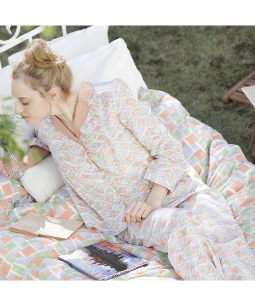 通気性の良い薄手のインド綿でつくられたkapuwaオリジナル柄、ikat柄のパジャマ。手紡ぎ手織りのカディー素材を使用した肌触りの良いコットンです。風合いのある生地にインドの伝統技法、木版プリントを使ってハンドプリントしたkapuwaオリジナルのikat柄がパジャマにぴったりなリラックス感を出しています。やわらかい優しい印象のライトグリーン×ピンクの配色と、爽やかで涼しげなネイビー×ライムグリーン。ベーシックな前開きボタンのトップにウエストゴムでウエストリボン付きのゆったり系8分丈ボトムが程良い丈感で、着脱のしやすさも◎です。季節を問わずオールシーズン着られるコットン素材☆お部屋の中で、寝具として、お気に入りのパジャマを着てHAPPYな気分になりたい方におすすめです♪ 素材:コットン(インド綿カディ)100% サイズ:FREE 【TOPS】着丈:60cm 肩幅:37.5cm バスト:104cm 裾幅:58cm 【BOTTOMS】ウエストゴム上がり:64cm 着丈79cm ヒップ:100cm 裾幅:24cm