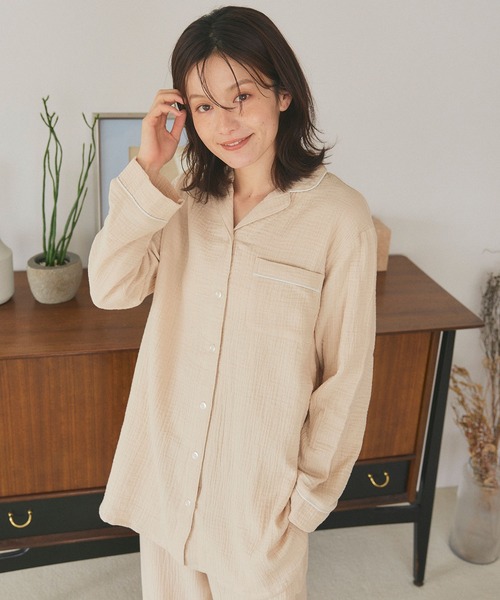 アクセントになるパイピングデザイン 空気を含んでふんわりと優しい肌触り 軽い着心地の綿100%ダブルガーゼ素材のパジャマです。 綿ならではの肌ざわりの良さと洗うほどに柔らかく馴染んでいくのも魅力。 ナチュラルでリラクシングな雰囲気のデザインでルームウェアにも◎。 【デザイン】 ・襟元や足首、胸ポケットにはアクセントになるパイピングデザインで、ディテールにもこだわったアイテムです。 ・バストの切替からふわっと広がる、フレアシルエットが印象的。 ・お顔まわりを華やかに見せてくれるオープンカラーのネックラインで綺麗に見せてくれます。 ・ボタンはガーゼ生地とも相性のいい配色で、ほっこり温かみのある雰囲気に◎ 【素材】 ・綿100%のダブルガーゼ生地を使用。ふんわり空気を含んだようなやわらかい肌あたりと、軽い着心地が特徴です。 ・ガーゼ生地は吸水性や通気性に優れているので汗をかいても蒸れにくく、お風呂上りや睡眠中もさらっと着用いただけます。 また生地を2枚重ねることで空気の層ができ、保温性も◎ シーズン問わずに着用いただける素材です。 【カラー】 アイボリー チャコール ベージュ 【サイズ】 M L LL 【仕様】 ポケット付き ウエストゴム 【ご注意】 ※タンブラー乾燥はお避けください。 ※濃色品は、摩擦による色移りにご注意ください。また、淡色品と分けて洗ってください。 ※淡色品は、無蛍光洗剤を使用してください。 ※淡色は若干の透け感がございます。 ※付属品・アクセサリー付きのものは、他のものとのひっかけにご注意ください。