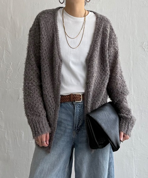 ふんわりとしたフェザーヤーンを贅沢に使用し、軽やかなメッシュ編みで仕上げたカーディガン。 ニットならではのぬくもりを感じながらも、軽い着心地です。 【素材】 フェザーヤーンをメッシュ編みした素材。 【デザイン】 Vネックミドル丈カーディガン。 【ポイント】 秋から着られる軽く仕上げたニットカーデ。 フェザーで季節を感じられますが、メッシュ編みにすることで軽く暑くなく着ることができます。 袖と裾はリブ使いでしっかり感あり。 [洗濯方法]洗濯の際はネットを使用してください [クリーニング] 手洗い可、ドライクリーニング可(F)、ウェットクリーニング(W)