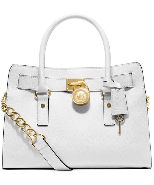 Soft leather and luxe hardware grace this gorgeous design from MICHAEL Michael Kors. Bold chain detailing and a prominent signature lock charm at front perfectly accent this femme satchel silhouette. Saffiano leather Double handles with 5" drop; shoulder strap with 11" drop Magnetic snap closure Gold- or silver-tone hardware; signature charm Interior features zip pocket, 2 slip pockets and key fob 12-3/4" W x 9" H x 5-1/2" D Silhouette is based off 5'9" model Includes dust bag Imported
