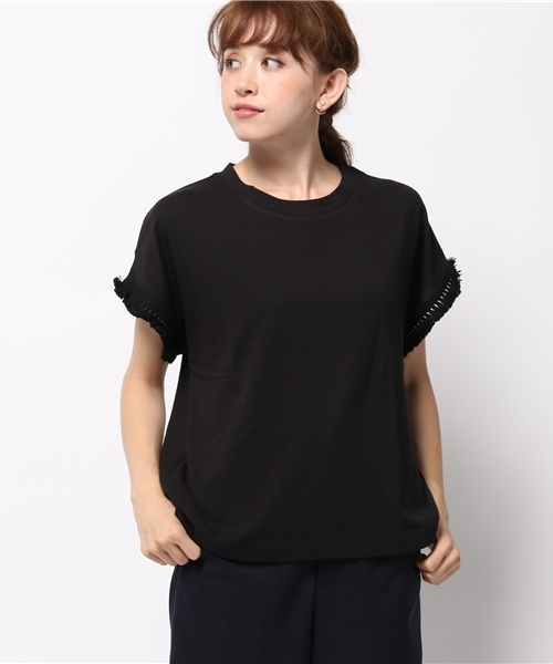 袖部分にフリンジがあしらわれた半袖カットソー。トレンドのフリンジアイテムを、ベーシックにデイリーに溶け込むアイテムで取り入れました♪カジュアルにスカートにインして着たり、デニムパンツとも合わせやすい1枚です。袖もワイドに広がりつつストンと落ちてくれるので腕が細く見える効果も期待できるところが嬉しいポイント。