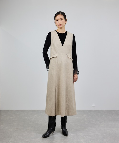 ウエスト切り替えで自然にメリハリ。着るだけでスタイルアップを叶える!秋見えツイードジャンパースカート【デザイン・シルエット】 シャープでスッキリ見えする深Vネックと、ウエスト位置のフラップが特徴のツイードジャンパースカートです。ウエストラインを少し高く設定し、脚を視覚的に長く見せてくれるデザインに加え、後ろのウエストベルトでラインをスッキリ見せてくれる効果も期待できます。お手持ちのカットソーやブラウス、ニットの上から着用できるので、気温に合わせたコーディネートを気軽に楽しめるのも嬉しいポイントです。 【おすすめのスタイリング】 ツイード素材で少し温かみがあるので、艶感のあるブラウスの上から着用するスタイリングがおすすめです。また、フィット感のあるニットと合わせる着こなしもおすすめです。 【素材】 シルクネップ糸を使用し、表情豊かなツイードを表現した梳毛素材です。秋冬らしい素材感でトレンド感も感じられます。手洗い可能なのも嬉しいポイント ---------------------------- 透け感:なし 裏地:あり 伸縮性:なし 光沢感:なし 生地の厚さ:中肉 ポケット:あり 開き方:かぶり 洗濯:手洗い可能 ---------------------------- 【モデル情報】 モデル身長:175cm 着用サイズ:F ※画像の商品はサンプルです。実際の商品と仕様、加工、サイズが異なる場合がございます。 ※撮影場所やライティング、お使いのモニター環境によって色の見え方が異なる場合がございます。 ※商品のカラーは画像の色味をご参照ください。動画は仕様説明のため、色味が実物と異なる場合がございます。