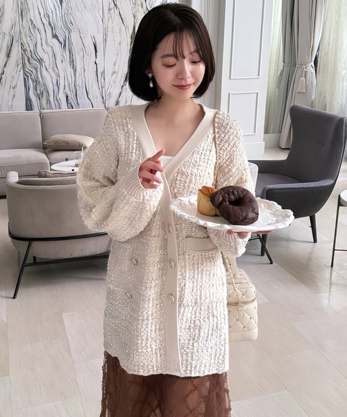 何種類もの糸を組み合わせ表情豊かに演出した特別感のあるニットツイードカーディガン。フロントに施されたゴールドダブル釦がアクセントとなり目を惹くポイントです。タイトすぎない程良いシルエットとヒップラインをカバーしてくれるミドル丈で着やすさも抜群◎ミニボトムやロングスカート、パンツなど合わせるアイテムによって様々な着こなしをお楽しみいただける1着です!**********************透け感:オフホワイトややあり裏地:なし伸縮性:あり光沢感:なし生地の厚さ:普通ファスナー:なし付属品:なし**********************※商品画像はサンプルのため、色味やサイズ等の仕様に変更がある場合がございますので、予めご了承下さい。※取り扱いについては、商品についている品質表示でご確認ください。※こちらの商品は、ROYAL PARTYでの取り扱いになります。直接店舗へお問い合わせの際はROYAL PARTY店舗へお願い致します。※照明の関係により、実際よりも色味が違って見える場合があります。またパソコン・スマートフォンなどの環境により、若干製品と画像のカラーが異なる場合もございます。予めご了承ください。※サイト上のカラー名と、お届け商品に記載されているカラー名が異なる場合がございます。【商品のお気に入り登録】お気に入りアイテムの値下げ・再入荷・在庫1点などの通知を受け取ることができます。⇒カートの右のハートをクリック 【ブランドのお気に入り登録】新商品や再入荷、セール、クーポン配布などお得な情報を受け取ることができます。⇒上部ブランド名をクリック※お気に入りをするとZOZOのお気に入りアイテムページで簡単にcheckできて再検索不要です※