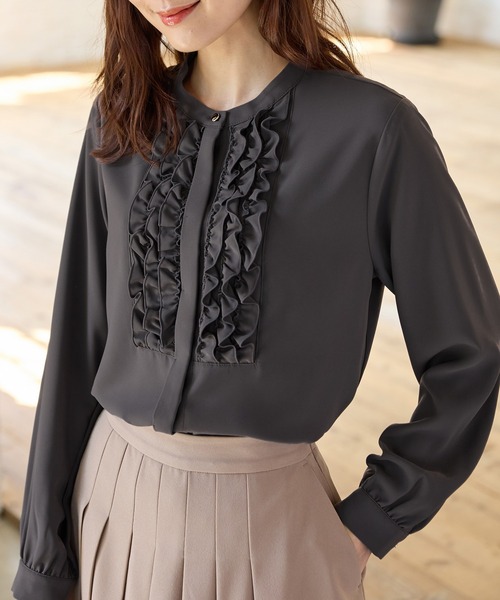 フリルで華やかに 【デザイン】 フロントのフリル使いが華やかな大人可愛いデザインに、バンドカラーできちんと感をプラス。 ボタンを隠した比翼仕立てでさらに上品な印象に。 【素材・機能】 滑らかで着心地抜群の落ち感素材。 【スタイル】 ジャケットにも合うサイズ感で、テーパードパンツやフレアスカートと合わせたきれいめお仕事スタイルから、デニムと合わせたカジュアルスタイルまで、幅広い着回しに活躍。 品番:525-61-0156