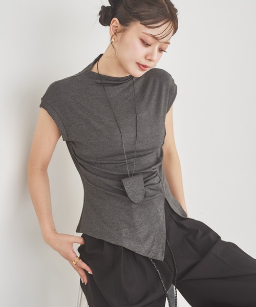 同色のキーネックレス付きのオフネックカットソー。 柔らかさとしなやかさを併せ持った、シルキーな風合いが特徴です。 裾の深めのスリットが抜け感を与え、フロントに施したタックによってドレープが生まれて自然と着映えが叶うのが魅力。 ボディラインにフィットする女性らしさを高めるシルエットは、フレンチスリーブとの掛け合わせでコンパクト且つ引き締まったデザインに。 くびれをキュッと細く見せてくれるのでスタイルアップにも期待できます。 ヘムラインを活かしたアウトスタイルはもちろん、前だけインしてスッキリまとめてもオシャレに決まります。 ■DETAIL ・透け感:ややあり ・生地の厚さ:薄手 ・裏地:なし ・伸縮性:ややあり <注意点> ・色合いはモニター環境により若干の誤差が出ます。 ・サイズは平置きにして測定していますが、測り方によって誤差が出る場合がございます。 ・入荷・生産時期により、色、サイズ、素材など多少異なる場合がございます。 ・本製品は生産過程におきまして、生地を織る際の糸の継ぎ目や多少のほつれが生じることがあります。 ・簡易包装となっており、保管・梱包時にシワが伴う場合がございます。