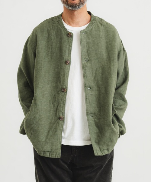 ヴィンテージライクな風合いの起毛フレンチリネンを使用したカバージャケット。 裏地を省いた軽やかな仕立てで、柔らかな肌触りが魅力です。 ゆったりとしたボックスシルエットはリラックス感があり、シャツ感覚で羽織れる一枚。 程よい厚みで着膨れしにくく、冬はアウターのインナーとしても活躍します。 【フレンチリネンブラッシュツイル】フレンチリネンを100%使用した厚地のツイル。 ドライなタッチとざっくりとした表情感を持つ麻素材に加工を施すことで、あたたかみのある風合いがプラスされました。 しっかりとした肉感ながらも、ふっくらとした柔らかさと軽さのある素材です。