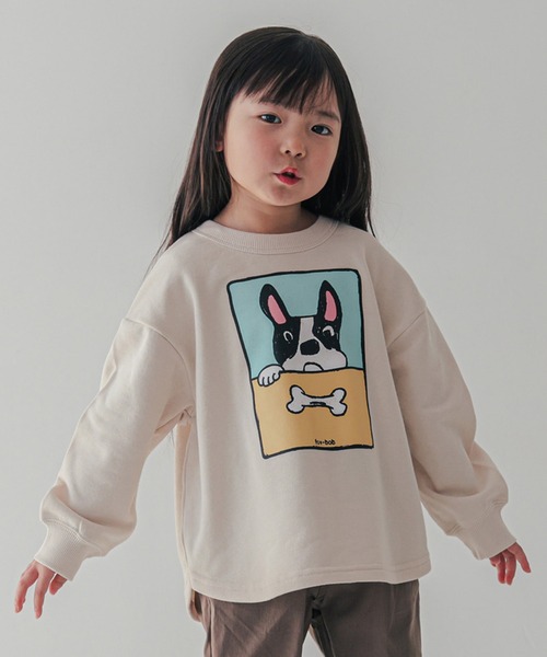 小さいお子様向けのFOVBOBのスウェットトレーナー。かわいらしいイラストプリントがポイントです。速乾性のあるポリエステル混の裏毛素材です。-----透け感:無し伸縮性:ありポケット:無しMODEL 01 / 105cm / kg / 110サイズ着用MODEL 02 / 106cm / 18kg / 110サイズ着用