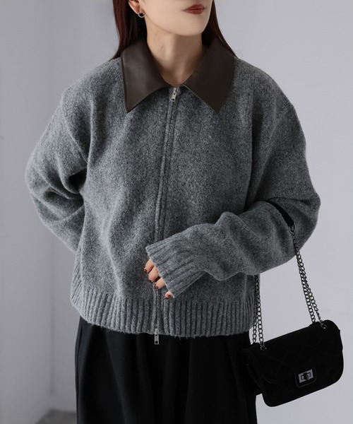 【Riberry 襟切替えダブルジップニット】\異素材の襟がアクセント/ダブルジップ仕様で着こなしの幅も広がる万能ニット♪■Styling上品さとカジュアルさを兼ね備えた、ブルゾン感覚で使える大人のためのダブルジップニットが登場しました。柔らかな風合いのニット素材をベースに、襟元には合皮素材を使用することで、程よいモード感と洗練された印象をプラス。身頃はややすっきりとしたシルエットで仕立てられており、裾や袖口にはリブを施すことでフィット感を高め、メリハリのあるデザインにに仕上げました♪ダブルジップなのでジップの開き具合で抜け感を演出したり、インナーをのぞかせたりと、アレンジの幅が広がります。デニムを合わせてカジュアルにまとめるのはもちろん、ワイドパンツやマーメイドスカートと合わせれば大人っぽくこなれた印象に。シンプルながらも存在感のある一枚なので、羽織るだけでスタイリングが決まる万能アイテムです。■Detailスッキリだけどフィットしすぎない余裕あるシルエットで、体型を拾いにくく着用しやすいです。短めの丈感でどんなボトムにも相性抜群!フロントにはダブルジップを採用しており、着こなしに合わせて上下どちらからでも開閉が可能◎コーデに合わせてお好みのスタイルで着用いただけます!■Material素材はポリエステル・アクリル・ポリウレタンの混紡で、軽やかな着心地ながらも伸縮性抜群!羽織りとしてもトップスとしても着れるので、デイリーに使いやすいのも嬉しいポイント。素材の切り替えが新鮮でブルゾン感覚で使えるので、秋冬のスタイリングにぴったりです。▽生地感透け感:あり 〇〇●〇〇 なし(白系ややあり)生地の厚さ:厚い 〇〇〇●〇 薄い裏地:なし伸縮性:あり※商品の梱包には細心の注意を払っていますが、通販の特性上、到着時に畳みシワがついている可能性がございます。予めご了承ください※この素材は摩擦(特に湿った状態での摩擦)や雨、汗でぬれた際には他の衣料等に色が移ることがございますのでご注意ください。※お肌のデリケートな方は刺激を感じる場合がございます。※詳しいお手入れ方法は商品タグをご参照ください。【Information】◆《お気に入り登録》がオススメ◆・「商品のお気に入り登録」で再入荷通知や、ラストの通知、セール通知も受け取ることが出来ます。・「ブランドのお気に入り登録」で新商品や再入荷など、お得な情報を受け取ることが出来ます※撮影時のライティング、ご覧になっているモニター・PC環境により、実際の商品と色味が異なって見える場合がございます。予めご了承をお願い致します。