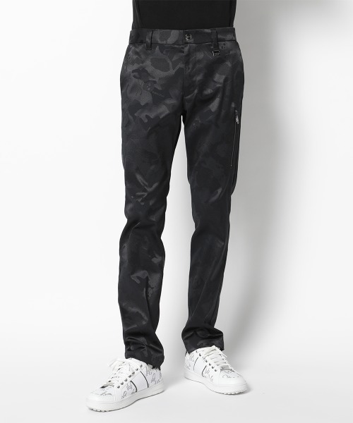 【2025 AUTUMN WINTER COLLECTION】 カモフラージュパターンのストレッチジャカード素材を使用したロングパンツ。上品な光沢感と適度なストレッチ性を兼ね備えた季節を問わず活躍する万能アイテム。・上品な光沢と快適なストレッチ性のあるカモフラージュパターンのジャカード素材 ・スタイリッシュな印象を演出するタイトシルエット ・両脇スラッシュポケット、左前にはファスナー付きパッチポケット ・ヒップには2つのウェルトポケットを配置 ・後ポケット下にはブランドロゴ刺繍、左前にロゴ入りチャーム付き ・右脇のループには便利なリングディテールタウンユースにもラウンドにも対応できる、機能性とデザイン性を両立した一本です。