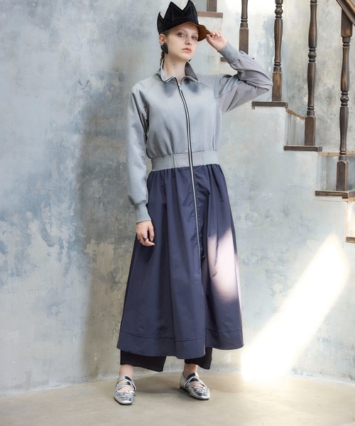 MARECHAL TERRE / ジップブルゾンワンピース スタンドカラーのスポーティーMIXなデザイン。ワンピースとしても前開きでライトアウターとしても着られるアイテムです。上下で配色になっていてウエストがゴム仕様でスタイルアップして見えます。スカート部分はナイロンライクな軽いお素材でフレアラインがカジュアルすぎず◎大人カジュアルな雰囲気たっぷりのデザインです。--------------------------------------透け感:なし裏地:なし伸縮性:なしケア方法:手洗い可※お洗濯の際は洗濯表示を必ずご確認ください。--------------------------------------