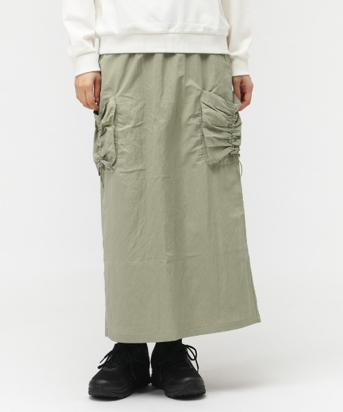 商品情報 AUTUMNコレクションから、ナイロンのウーブン素材を使用したロングスカート。撥水加工を施したさり気ない光沢感としぼ感がある生地で、カジュアルにもきれいめにも幅広くコーディネートを楽しめるアイテム。シャーリングが目をひく大きめのポケットがアクセント。タフタ裏地付きで、長いシーズン重宝する1枚です。 特徴 WATER REPELLENT : 撥水機能 詳細 左腿にキャットロゴ刺繍 サイドビッグポケット メッシュ裏地付き