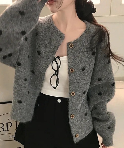 可愛らしいドット柄で華やかに。クルーネックニットカーディガン ■デザイン ・顔周りをすっきり見せるクルーネックデザイン ・遊び心のあるドット柄がシンプルコーデのアクセントに ・ややゆったりしたシルエットで重ね着もしやすい ・ベーシックながらも可愛らしい印象で、1枚で着映え ■素材 ・柔らかく軽やかなアクリル素材 ・伸縮性があり、体に程よくフィットして動きやすい ・肌触りも良く、快適な着心地でデイリーに最適 ■スタイリング ・シンプルなカットソーやシャツの上に羽織ってアクセントに ・スカートやパンツと合わせてカジュアルからきれいめまで幅広く活躍 ・ボタンを留めてトップスとしても、羽織としても着回せる ----------------------------- 透け感:なし 伸縮性:あり 裏地:なし ------------------------------ ------------------------------ 【スタッフが着用しました!】 身長:158cm 普段着用サイズ:S~Mサイズ 今回着用サイズ:FREEサイズ ■着用感 ・程よくゆったりしたシルエットでリラックス感のある着心地 ・柔らかく軽やかで、重ね着もしやすい ・クルーネックで首元がすっきり、抜け感のあるスタイルが完成 ------------------------------------------------ 【お買い物をよりお楽しみいただく為に】 ▼お気に入り登録 サイズ・カラーを指定して、♡マークをクリック![セール通知・ラスト1点の通知・完売アイテムの再入荷通知]を受け取ることができます。 ▼ブランドのお気に入り登録 新商品や再入荷、タイムセールやクーポン等いち早くブランドのお得な情報を受け取ることができます。 ------------------------------------------------ ※取り扱い上のご注意 染色の特性上、発汗や摩擦により色落ちしたり他のものに色移りすることがありますのでご注意ください。 韓国 オフィスカジュアル ガーリー 大人カジュアル 韓国ファッション 秋服