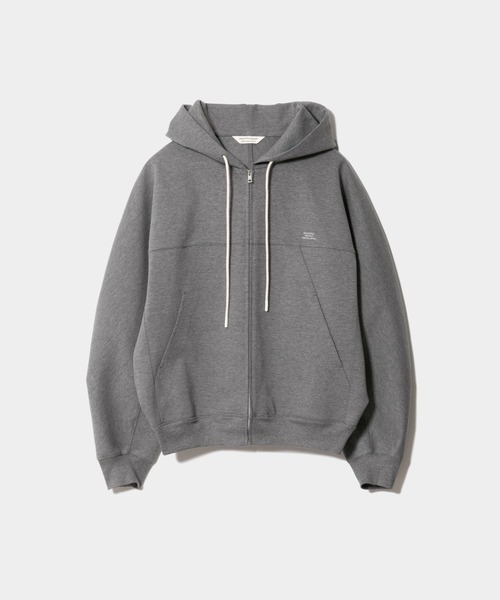 【デザインの特徴】 ・ボリューミーな袖が特徴的なZIP UPパーカー ・視点を変えて上から見ることで生まれた特徴的なパターン ・肩線もアームホールもないユニークなカッティング ・コンパクトに見えつつ身巾と袖巾にゆとりのあるシルエットが特徴 ・切り替え下から入るカンガルーポケットがポイント ・樹脂ディップ加工を施したセルチップコードがアクセント ・腰丈 【素材のこだわり】 ・ハイゲージのハリと肉感のあるダブル接結ジャージー ・表、つなぎ、裏を番手差をつけず全て同じ糸で編むことで接結点が目立たない均一の表面感に仕上げた素材 ・布帛のような適度な硬さとハリが特徴