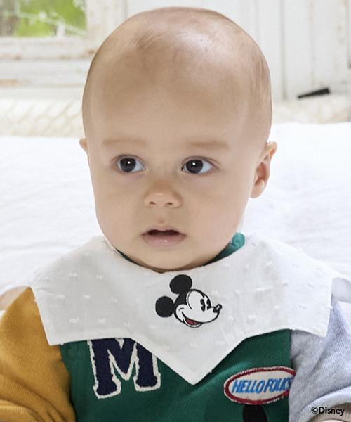 繊細に刺しゅうされたミッキーマウスのお顔が目を引くスタイです。 星型のようなデザインで、首元にポップな印象をプラスします。 やわらかい綿100%生地で仕立てており、肌当たりの良さも魅力。 バックネックはスナップボタンつきの設計で、首まわりを2段階に調節できます。