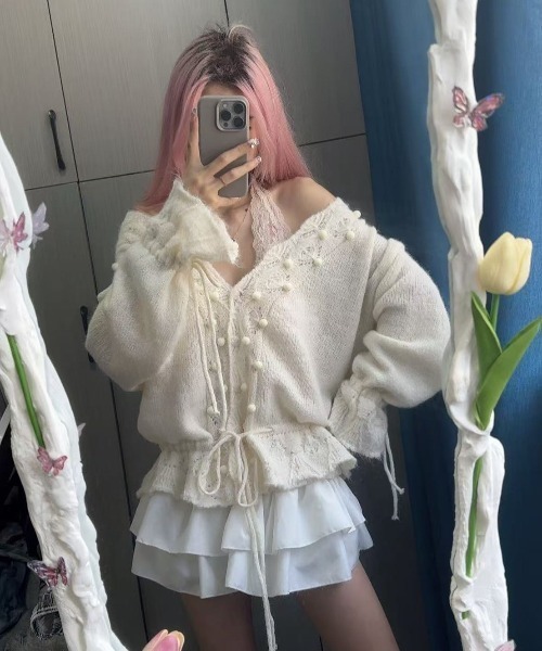 ポンポンとフリルが可愛すぎるニットカーディガン♡ ゆったり羽織れるサイズ感に裾と袖口が絞れるデザイン。丸みを帯びたシルエットが作れて、ナチュラルで優しい雰囲気のコーディネートが作れます。 ティアードスカートやレーストップスと合わせてフェアリーコアなコーディネートを。 ※モニター・環境等により実際の商品と多少色味が異なって表示される場合がございます。あらかじめご了承ください。 ※海外輸入品のため、商品の入荷時期によって色合い、生地、デザイン等に若干の違いがございます。 商品の細部仕様は予告なく変更になる場合がございます。