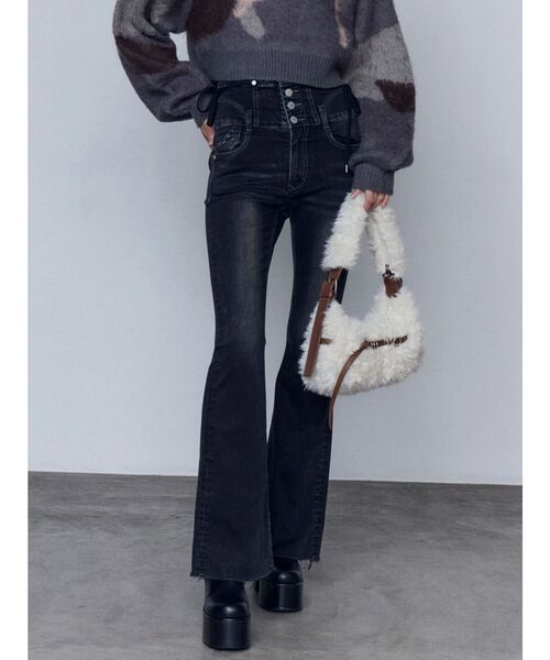 サイドに垂れるようなリボンディテールがポイント■デザイン合わせるトップスの丈感に合わせてリボンの見える長さを調整して頂けます。しっかり深さのあるハイウエストと、シェービングの加工で美脚効果も抜群。強めの加工感でスタイリングのポイントになる1本です。リボン紐は釦で取り外しが出来るデザインです。■スタイリング4つ釦のハイウエストなので、ショート丈トップスとの相性抜群。サイドのリボンを見せるスタイリングがイチオシ。加工感が少しカジュアルな印象なので、バッククロス2WAYニットのような女性らしいアイテムと合わせたバランスがおすすめです。※着用画像はフラッシュの加減で実際の製品と色味等が異なる場合がございますので、生地のズームアップ画像をご確認ください。※ご利用の端末画面の設定により実際の商品と色味が異なる場合がございます。【商品特徴】透け感:なし伸縮性:ややあり生地の厚さ:普通サイズ感:普通裏地:なしポケット:あり