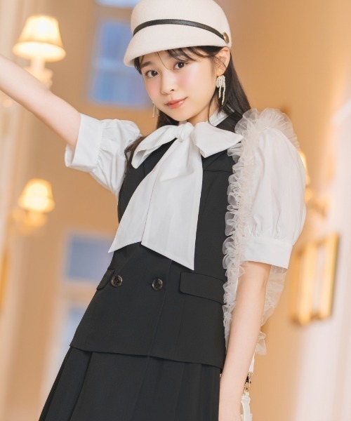秋のワードローブにプラスワン!レイヤードスタイルを楽しめるショートジレ【Design】・きちんと感を演出してくれるダブルボタンショートジレが登場♪・リボンタイブラウス、Tシャツ、タートルニットなど、これからの季節で活躍する、合わせるアイテムを問わない優秀アイテムです。・両サイドに便利なポケット付きで、実用性も◎・後ろのベルトを調整することで、ウエストサイズをお好みに合わせてアレンジいただけます♪・同シリーズの【ハイウエストプリーツミニスカート(品番:20082522200086)】とセットアップで着こなすのがおすすめ。・秋の定番アイテムとして、一枚あると着こなしの幅が広がります!・胸元はフェイクポケットです。【Fabric】・柔らかな風合いが魅力の素材で、女性らしい印象に。・ハリ感のあるポリエステル素材で、きちんと見えを叶えてくれます。・ピンク、ブラウン、ブラックの3色展開となります。【Care】ドライクリーニングF:(00):着丈58cm/身幅45.5cm/肩幅34cm/ウエスト80cm/裾回り100cm