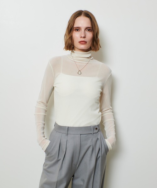 【allureville 2025 autumn&winter】フロッキー加工を施したチュールタートル。ほんのり透け感があり、柔らかく伸縮性のある生地が身体にやさしくフィットし、レイヤードスタイルにも最適。一枚着としてはもちろん、ワンピースやニットにプラスすることで、秋冬の装いを華やかに引き立てます。ご自宅で手洗いが可能なので、お手入れも簡単です。※照明の関係により、実際よりも色味が違って見える場合がございます。またパソコン・スマートフォンなどの環境により、製品と画像のカラーが異なる場合もございます。予めご了承ください。