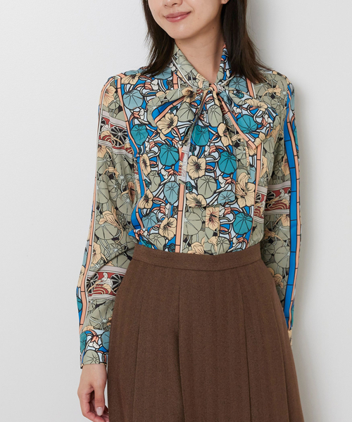 ステンドグラスをイメージさせる総柄デザインをあしらったブラウス。秋冬らしいウォームカラーがレトロな雰囲気を演出します。首元のボウタイデザインが顔周りを華やかに魅せ、小顔効果も期待大。フロントボタンの比翼仕立てが上品な印象をプラス。一枚はもちろん、ジャケットと合わせたレイヤリングでも存在感を放つ、主役級アイテムです。 ・透け感なし ・ストレッチなし ・カラー展開はイエロー、パープル ・サイズ展開は0(S)7号・1(M)9号・2(L)11号・3(2L)13号・4(3L)15号・5(4L)17号