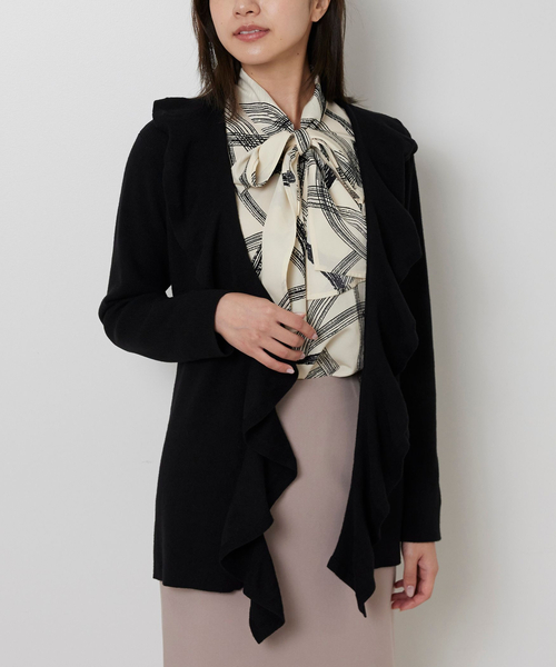 上品なハイゲージニットに、贅沢にあしらった立体感のあるフリルデザインが華やかに魅せるカーディガン。フロントのフック仕立てがきちんと感を演出し、共生地のウエストテープを使って、気分やコーデでスタイルチェンジできるのも魅力ポイント。シンプルなインナーにプラスするだけで洗練されたスタイリングが完成します。・カラー展開はブラック、ボルドー、ブルー・サイズ展開は1(M)9号・3(2L)13号