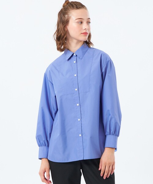 <ブラウスのようなディティールを備えたレギュラーカラーシャツ>ワイドフィットのレギュラーカラーのシャツブラウス。クラシカルな印象のブザムデザインでありながら、リラクシーなシルエットで抜け感のある雰囲気に。一枚でももちろん、ベストやニット、ジャンスカなどのレイヤードスタイリングにも活躍します。カジュアルからキレイ目なシーンまで幅広いシーンで活躍するクリーンな印象の一着です。【素材】コットンライクなポリエステル100%素材。ハリ感がありながらも柔らかな風合いが特徴です。家庭でもお手入れしやすいのがうれしいポイントです。おすすめ着用期間:春/秋/冬※36サイズはオンラインストア、ルミネ新宿店、柏髙島屋ステーションモール店、ジェイアール名古屋タカシマヤ店、山形屋店、博多阪急、阪神梅田本店のみでのお取扱いになります。※この商品はサンプルでの撮影を行っています。実際の商品とイメージ、仕様が異なる場合がございます。
