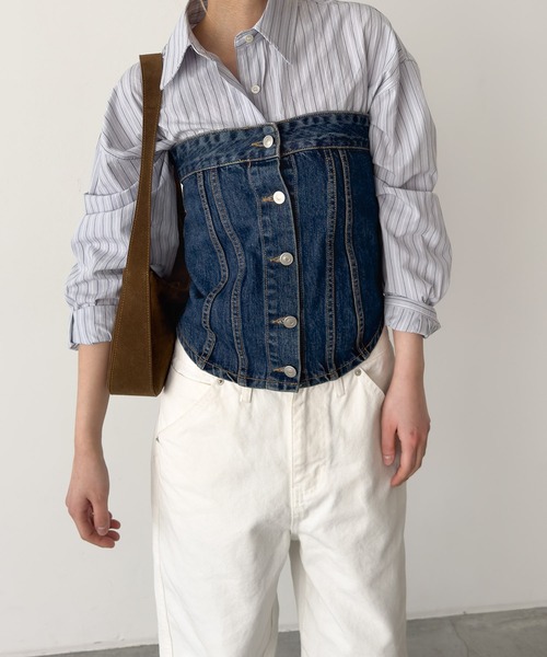 デザイン コーディネートの幅が広がるデニムビスチェ。 裾のボタンでサイズを調節していただけます。 素材 ノンストレッチですが柔らかく、着心地抜群。 コットン100%素材なのでオールシーズン活躍してくれます。 コーディネート アクセサリー感覚でコーディネートのプラスワンアイテムに◎ シャツや薄手のカットソーとのレイヤードスタイルがおすすめです。 diggity(ディギティ) diggityとはスラングで"イカシタ"という意味です。 ------------------------------------- 生地の厚さ:厚い〇〇●〇〇薄い 伸縮性:なし 透け感:なし 裏地:なし 光沢:なし ・裾ボタンでサイズ調節可能 ------------------------------------- 取扱い ・こちらの製品はインディゴ染料を使用しております。 洗濯の際は、色落ちしますので、単品洗いをしてください。また洗濯により徐々に色あせします。 ・濃い色と白 ・淡色物は分けて洗ってください。洗濯後はすばやく形を整えて干してください。タンブラー乾燥はお避けください。 ・アイロンの際は当て布をご使用ください。 ・着用時の汗や摩擦により、他の衣類や鞄などに色移りすることがありますので、淡色系との着合わせはご注意ください。 ・摩擦や引っかけにご留意ください。 ※取り扱い及びお手入れ方法については、商品についている取扱表示、洗濯表示にてご確認下さい。 ※照明の関係により、実際よりも色味が違って見える場合があります。またパソコン・スマートフォンなどの環境により、若干製品と画像のカラーが異なる場合もございます。 ※商品の色味は、商品アップ画像をご参照ください。