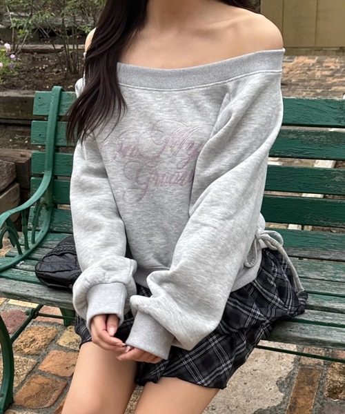 ラインストーンが輝く主役級スウェット!3wayラインストーンビッグロゴスウェット 【デザイン】 フロントの煌めくラインストーンロゴとサイドのドロストが目を引くスウェットです。 肩の開き具合を調整でき、ベーシックなクルーネックやワンショルダー、 オフショルダーと3WAYで着こなせるデザイン。 短めの丈感がトレンドライクで、どの着方でもバランスよくスタイルアップが叶います。 【素材感】 着心地の軽いポリエステル素材 伸縮性:あり/ 透け感:なし / 裏地:なし 手洗いによる洗濯可 / ウェットクリーニング可 【コーディネート】 クルーネック風でデニムやジョガーパンツを合わせればカジュアルに。 ワンショルダー風にすれば女性らしさをプラスしたストリートスタイルに。 オフショルダー風ではミニスカートやフレアパンツと合わせて、抜け感のある大人可愛い雰囲気に仕上がります。 シーンや気分でアレンジが楽しめる一枚です。 【※お取り扱い上のご注意】 1:モニター環境等により実際の商品と多少色味が異なって表示される場合がございます。予めご了承下さい。 2:屋外で撮影された商品は、天候により多少実際のカラーと異なる場合があります。商品のカラーはトルソー(マネキン)の商品画像をご参照ください。 3:濃い色の商品は、お洗濯や摩擦等による移染にご注意ください。 4:末永くご愛用頂く為に、アテンションタグ・洗濯ネームを必ずご確認の上、着用又はお取り扱い下さい。 5:生産時期により、色、サイズ、デザイン、素材の質感が多少が異なる場合がございます。あらかじめ御了承下さいませ。