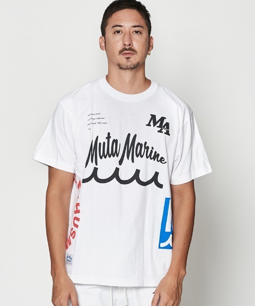 マリンブランド<muta MARINE>とのコラボコレクションMaterial 5.6oz 天竺上質な20sコーマコットン糸を使用し、程よい厚みに仕上げたコットン100%カットソー生地。洗うことで風合いが増していきます。Spec 首フライスは2本針縫製、丸胴に編み立てた身頃を使用したベーシックなシルエットのTシャツ。フロントにはオリジナル織りネームを配置。これまでにコラボレーションで使用された4種類のロゴを、テストプリントしたような位置にシルクスクリーンプリントを施しています。たまたまデットストックで見つかったスペシャルなヴィンテージプリントTシャツをイメージ。※写真はサンプルの為、実際の商品は若干仕様の変更を施される場合もございます。その際はご了承の程お願い致します。