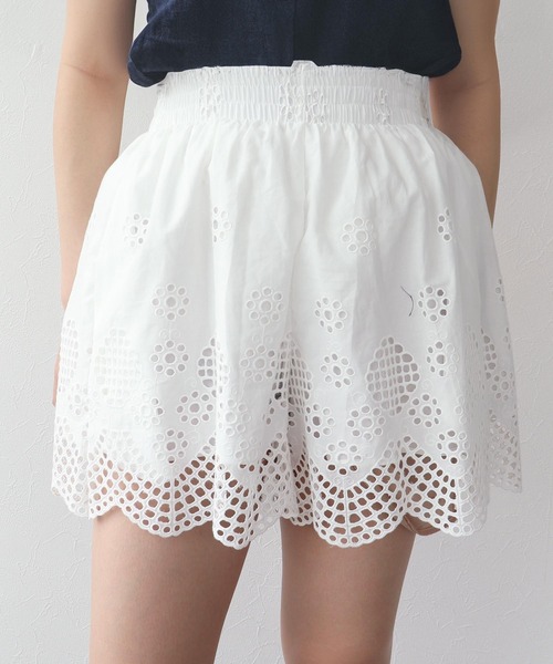 甘めな刺繍が施されたショートパンツ ふんわりコロンとしたシルエットとレースのような刺繍で可愛さ満点◎ 同シリーズのトップスとセットアップのコーデもおすすめです。 -------------------------------------- 透け感:裾部分のみあり 裏地:あり 伸縮性:ややあり ケア方法:ドライクリーニング ※お洗濯の際は洗濯表示を必ずご確認ください。 --------------------------------------