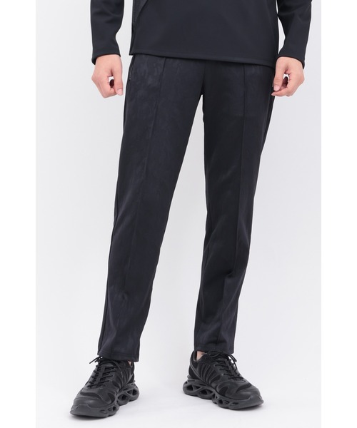 [DESIGN] 上品な光沢を放つダブルジャカードに、カモフラージュ柄を縦に再構築。トラッドにもストリートにも寄らない、唯一無二の存在感を放つイージーパンツ。 ほどよくテーパードさせたシルエットは、リラックスした穿き心地と脚線美を両立。ドローストリング仕様のウエストに、さりげなく配した光沢パーツやファスナーがアクセントとなり、スポーティさの中に確かなラグジュアリーを宿します。 パイピングには、ジャケットと同様に光沢デシンを採用し、全体のディテールを繊細に引き締め。ジャケットとセットアップでの着用はもちろん、単体でもスタイルに品格を添える一本。 [TEXTILE] TORNADOMARTの日本産別注ダブルジャカードは、カモフラージュパターンを縦柄へと再構築し、モダンな存在感を纏わせたオリジナルデザイン。ポリエステルとポリウレタンを巧みにブレンドした糸使いにより、しなやかなストレッチ性と美しい光沢を実現。光の角度で艶やかに揺れる表情が、エレガンスとワイルドさを同時に引き立てます。 機能性と美しさが共存する、唯一無二の素材です。