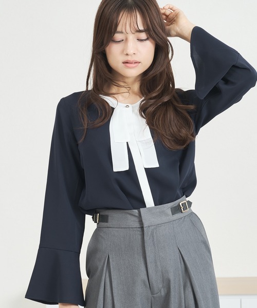【WEB限定アイテム】胸元に施されたタックとボウタイデザインがフェミニンな印象のブラウス【 design 】配色がシンプルながらも存在感をプラスします。袖は女性らしいベルスリーブでクラシカルで華やかさを演出します。ラウンドネックで優しい印象にしてくれます。コロンとした丸みのあるボタンがアクセントになります。シワになりにくく、サラッと着ていただけます。【 styling point 】ジャケットやカーディガンのインナーとしてオフィスシーンはもちろん、華やかなフレアスカートなどと合わせるとお呼ばれスタイルにもぴったりです。※ご覧のモニター環境や光の照射・角度により、画像の色味と多少異なる場合がございます。ご了承ください。----------------------------透け感 [一部あり]裏地 [なし]伸縮性 [ややあり]生地の厚さ [ふつう]----------------------------【 お買い物をお楽しみいただく為に 】▼お気に入り登録をオススメします。 『♡』をクリックすると…・《商品のお気に入り登録》で再入荷通知や ラスト1点の通知、セールやクーポンの通知も 受け取ることができます。・《ブランドのお気に入り登録》で新作商品や再入荷など、 お得な情報を受け取ることができます。