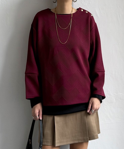 表情豊かな幾何学ジャカードのプルオーバー。パフスリーブがポイントです。【素材】幾何学柄のふくれジャカードカットソー。【デザイン】パフスリーブでボート風ネック。【ポイント】肩ボタンがデザインポイント。今年はやや小さくなりより着やすくなりました。前裾には切り替えを入れているため、カジュアルにも着られます。