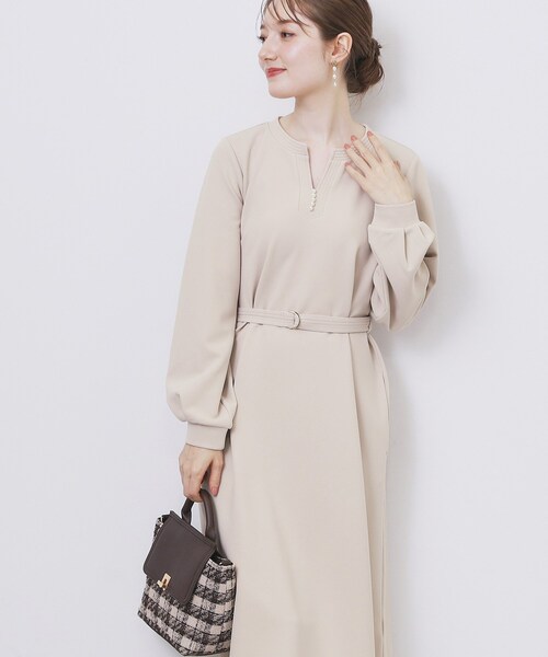 カットジョーゼットのストレッチ感が着心地良くキーネックにパール調釦があしらわれた上品なワンピース【デザイン】・キーネックデザインが特徴的で、顔周りをすっきりと見せる効果があります。・フロントのパール調ボタンが上品なアクセントとなり、華やかさをプラス。・ウエストにベルトが付いており、シルエットを調整できるのが魅力です。・長袖のデザインが、季節感を感じさせつつも、エレガントな雰囲気を演出。・シンプルながらも洗練された印象を与え、さまざまなシーンで活躍します。【素材】・カットジョーゼットを使用し、柔らかく滑らかな肌触りを実現。・高いストレッチ性があり、動きやすさを確保しつつ、体にフィットします。・程良い肉感で肌離れも良く、通気性に富んでいるので、快適に着用していただけます。・洗濯機でのお手入れが可能で、日常使いに最適なアイテム。【仕様】・ポケット数:横×2・裏地なし※グレージュ(050)はやや透け感があるため、インナーの着用をおすすめします。※照明の関係により、実際よりも色味が違って見える場合があります。また、パソコン・スマートフォンなどの環境により、若干製品と画像のカラーが異なる場合もございます。モデル情報:身長163cm B81 W56 H82 着用サイズ:38(M)店舗へのお問い合わせ商品番号:C58-54026●製品寸法:36(S):着丈100cm B94cm 袖丈55cm 肩幅33cm W96cm H102cm 付属ベルト全長106cm 付属ベルト幅2.5cm 対応サイズフリー38(M):着丈101cm B97cm 袖丈56cm 肩幅34cm W99cm H105cm 付属ベルト全長108cm 付属ベルト幅2.5cm 対応サイズフリー40(L):着丈102cm B100cm 袖丈57cm 肩幅35cm W102cm H108cm 付属ベルト全長110cm 付属ベルト幅2.5cm 対応サイズフリー42(LL):着丈103cm B103cm 袖丈58cm 肩幅36cm W105cm H111cm 付属ベルト全長112cm 付属ベルト幅2.5cm 対応サイズフリー44(3L):着丈105cm B106cm 袖丈59cm 肩幅37cm W108cm H114cm 付属ベルト全長115cm 付属ベルト幅2.5cm 対応サイズフリー備考: