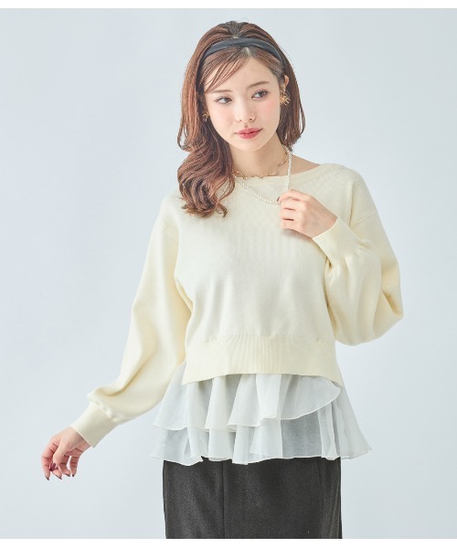 裾の2段フリルで、さりげなくスウィートを足し算。外してシンプルにも活用できる。【おすすめポイント】・裾に透け感のあるオーガンジーの2段フリル。甘くなりすぎず、トレンドのバレエコア風味が楽しめる。・フリルは取り外し可。すっきりシンプルなニットとしても活用できる。【こんな人、こんな時に】・甘すぎずさりげなく、トレンドのフリルを取り入れたい・リラックスできるゆったりめのシルエットが好き・おなかや腰まわりをカバーしたい【デザイン】・ゆったりしたシルエット、やや横広のラウンドネック・リラックス感のあるドロップショルダーで、太めのロングスリーブ・裾に、ボタンで着脱できる2段のオーガンジーフリル。上の段は斜めのヘムラインでアシンメトリーになり、細見せ&しゃれ感のポイント・裾のフリルを外すとジャストウエストくらいの丈。両サイドにスリット入りで、おなか周りがすっきり見える【素材】・本体はきめ細かくフラットな編地のハイゲージニット・ネック、袖口、裾はリブに編み替え・裾はほんのり透けるオーガンジー。ハリがあり、フリルの立体感がきれいに出る・フリルの上辺は等間隔にボタンホールがあいた平ゴム仕様。本体裾内側にボタン付きモデルサイズ:①160cm ②165cm着用サイズ:ワンサイズ