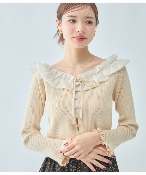 カーデとしても着回せるニット。シアーなフリルで軽やかフェミニン。【おすすめポイント】・ネックライン一周のオーガンジーフリルが、フェミニンなアイキャッチ。・視線を引き上げ、腰高・脚長なバランスで着こなせるショート丈。・フロントはリボン&ボタンで開閉。カーディガンとしても活用できる。【こんな人、こんな時に】・フリルやリボンを取り入れた、スウィートなテイストが好き・肌寒い時や、季節の変わり目の羽織りものとして【デザイン】・横広にあいたネックラインにアイボリーのオーガンジーフリルを一周し、顔まわりが華やか・ネック中央は、身頃と同素材のニットリボンを結ぶ仕様・フロントは、小ぶりなループボタン6個どめで繊細な表情。すき間が少しあくので、インナーを合わせての着用がおすすめ・ラグランのロングスリーブ。袖口は共生地のフリル・全体にほど良くフィットするシルエット。ウエストくらいのショート丈【素材】・身生地は伸びが良くきめ細かな編地のハイゲージニット・襟は透け感のあるオーガンジー。適度にハリがあり、立体感がきれいに出るモデルサイズ:①160cm ②165cm着用サイズ:ワンサイズ