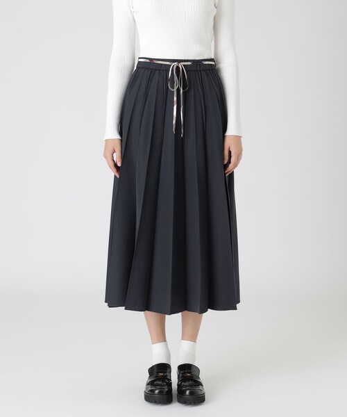 ◆プレッピーなコーディネートを楽しめるプリーツスカート【Design】プレッピーな気分を楽しめるチノライク素材のプリーツスカートです。ウエストがすっきり見える変形プリーツを採用しました。裾に向かって広がるシルエットがエレガントな印象を与えます。ウエスト部分がゴム仕様なので、着心地も快適です。【Styling】ベストコンビブラウス(55M06625)やカレッジロゴプルオーバー(55P11632)とのコーディネートがおすすめです。