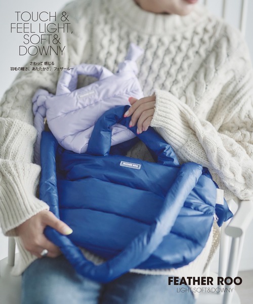 『今のわたしに。弾む、軽さ。』 羽毛の軽さ、やわらかさ。フェザールー。 軽さ、やわらかさ、ふわふわ感。 その秘密は、中に入ったダウンとフェザー。 しなやかで、空気をまとうような軽やかさ。 パステルカラーがかわいい! ふんわり優しい色合いのデザインで、毎日をちょっと特別にしてくれます。 魅力的なのが両サイドの「ルーポケット」。 内側でつながったスマートなポケットは、左右どちらからも中身を出し入れできる便利なつくり。 寒い日には、両手を入れればほんのり暖かい“ハンドウォーマー”としても大活躍。 遊び心のある機能で、アクティブな日常をもっと快適にしてくれます。 目を惹くのは、ショルダー部分の結び目デザイン。 左右にきゅっと結ばれたリボンのようなアクセントが、シンプルなフォルムに愛らしさを添えています。 結び目はデザイン性だけでなく、ショルダーの長さを調整できる実用的な仕掛け。 短めにして肩掛けでラフに、長めにして斜め掛けでアクティブに、シーンやスタイルに合わせて自在にアレンジできます。 ふかふかの優しい感触のハンドルとショルダーで、優しくフィット。 大人の毎日に寄り添いながら、ふんわり華やかさを添えてくれます。 サブにもメインにも使える、頼れるサイズ感。 ボトルやポーチなど、毎日の必需品がしっかり入ります。 さらに、ストールや手袋など季節の小物をプラスしても余裕のある収納力。 天マチ付きのファスナー開閉で、広々と大きく開き、荷物の出し入れもスムーズです。 内側には大小3つのポケットを配置。 パスケースやリップなど細々したものを整理できるから、バッグの中で迷子になる心配もありません。 大きめのファスナーポケットは、お財布や鍵など貴重品の収納にも安心です。 底部にはウレタンボンディングを施し、荷物が少ないときでも型崩れしにくい。 きれいなフォルムをキープしてくれます。 「フェザールー」があれば、どんなシーンでも気軽に持てて、あなたの毎日をもっと軽やかに。 さあ、思わず出かけたくなる軽快トートで、新しい日常を楽しんでみませんか? 品番「3686」01:ラベンダー 02:レモン 03:ベビーピンク 04:ブルー サイズ:W(上部)36(下部)27×H22.5×D12cm 持ち手30cm ショルダー140cm 重量:約250g ポケット:外側ファスナー付1箇所(入り口2箇所) / 内側3箇所 メイン開閉:ファスナー