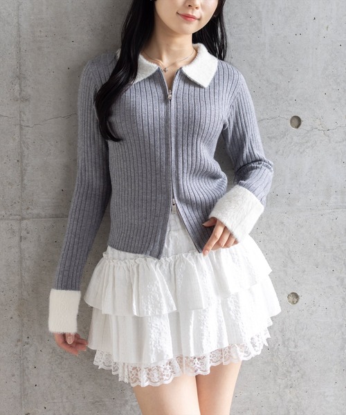 デイリーやお出かけにも活躍する!襟袖ショートフェザーダブルジップリブニットトップス【デザイン】襟と袖口にフェザーをあしらった、シーズンムード漂うリブニットトップスです。ショートフェザーの優しい表情が、リブ編みのすっきりとしたシルエットに華やかさをプラス。フロントはダブルジップ仕様で、着こなしのバリエーションを楽しめる一枚です。【素材感】耐久性のあるナイロン素材伸縮性:あり/ 透け感:IVのみ若干あり / 裏地:なし 水洗いによる洗濯不可 / ドライクリーニング可【コーディネート】デニムやミニスカートと合わせれば、トレンド感ある大人ガーリーなスタイルに。ジップを少し開けてインナーを見せれば抜け感を演出でき、ワイドパンツと組み合わせればモードな雰囲気にも仕上がります。秋冬のコーディネートをアップデートしてくれる万能アイテムです。【※お取り扱い上のご注意】1:モニター環境等により実際の商品と多少色味が異なって表示される場合がございます。予めご了承下さい。2:屋外で撮影された商品は、天候により多少実際のカラーと異なる場合があります。商品のカラーはトルソー(マネキン)の商品画像をご参照ください。3:濃い色の商品は、お洗濯や摩擦等による移染にご注意ください。4:末永くご愛用頂く為に、アテンションタグ・洗濯ネームを必ずご確認の上、着用又はお取り扱い下さい。5:生産時期により、色、サイズ、デザイン、素材の質感が多少が異なる場合がございます。あらかじめ御了承下さいませ。