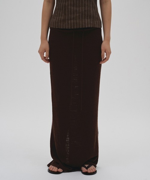 透け感のある編み地で軽やかに仕上げたニットスカート。ループ状の糸がを生み出す立体感が、ナチュラルなムードを引き立て、こなれた印象になります。Layered Polo Knitの外側の糸と揃えており、セットアップでのコーディネートもおすすめ。お手持ちのペチコートに合わせて、シーズンらしいスタイリングを楽しめる一枚です。
