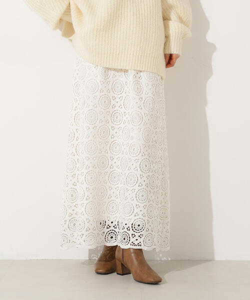 <petit size>PSサイズとは....通常のSサイズやMサイズから着丈などの長さを短くリサイズし、150cm前後の低身長さんにもバランスよく着用いただけるサイズに仕上げています。限定店舗のみの展開です。PSでのサイズ表記になっています。ヴィンテージライクな風合いのレーススカート。厚みのある程よくカジュアルなレース素材で、気取らずデイリーに着こなせます。スウェットやロゴニットなど、カジュアルなトップスと相性抜群。甘すぎない大人かわいいカジュアルスタイリングが楽しめます。シーズンレスで着回せるのも嬉しいポイント。<素材>やや厚みのあるケミカルレースを使用しています。<詳細>仕様・左ファスナー裏地・あり透け感・あり / 光沢・なし / 伸縮性・なし生地の厚さ・普通●取り扱いについては、商品についている品質表示でご確認ください。●撮影はサンプル商品で行っている為、仕様とサイズが異なる場合がございます。●スタジオ及び屋外で撮影した着用画像は、光の当たり具合やご覧のモニターによって色味が違って見える場合があります。予めご了承ください。●生産時期により色・素材・サイズ感など多少異なる場合がございます。予めご了承ください。〇返品・キャンセルについて・着用・洗濯後の返品・ご交換は致しかねます。・商品到着後、着用または使用前に商品を確認して頂きますようお願いいたします。≪お買い物をよりお楽しみいただくために!≫・「商品のお気に入り登録」再入荷通知や、ラストの通知、セール通知も受け取ることができます。・「ブランドのお気に入り登録」新商品や再入荷をはじめ、タイムセールやクーポンなどいち早くブランドお得な情報を受け取ることができます。